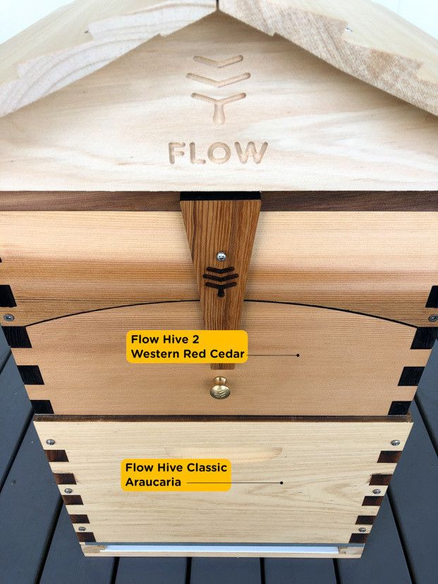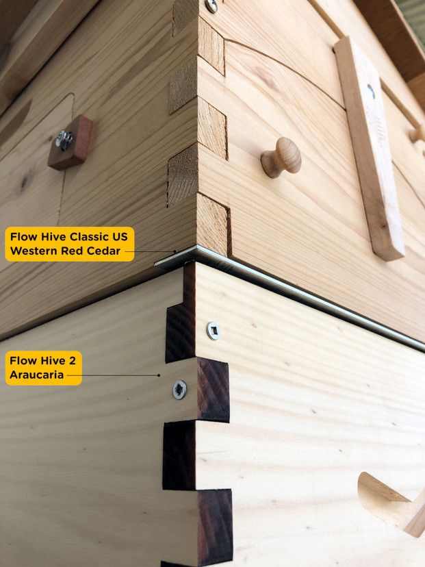 Due to varying supply sources and manufacturers, the thickness of timber can be slightly different across some products. There are size differences between the wood sources – Cedar, Araucaria or Paulownia and also between the different styles of hives, including Classics, Flow Hive 2 and Flow Hive 2+. This means that if you mix brood boxes or supers of different timber-type or style, there may be a gap between the boxes of up to 5mm.